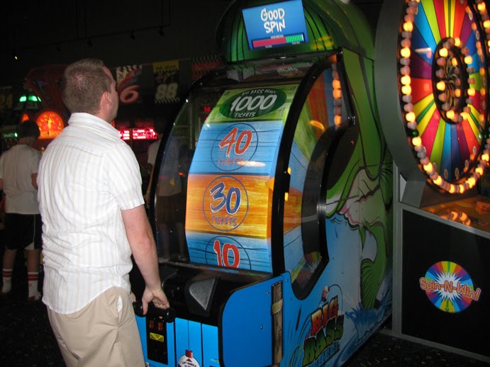 We played some games inside of Magic Mountain and got Alexa a bracelet with our tickets. Here is Dan doing the Price Is Right type spin-wheel in honor of it being Dad's fave game show (we sent him a picture message). After this we went to Coldstone for ice cream (even though we were both stuffed from dinner). It was crowded in there so we laid the back seats down and sat in the back of the van. We heard a kid say, "Hey Mom, look at those people eating in the back of their van." HAHA. We're old. It was a wonderful 4th Anniversary celebration!! And we're already looking to the future: we've decided to take our first kid-free trip at the end of next June to celebrate our 5th Anniversary. The kids will spend a week with Noni & Papa while we take a vacation to who knows where... somewhere with beaches and is all-inclusive, like a mini-version of our honeymoon ♥ ♥ ♥